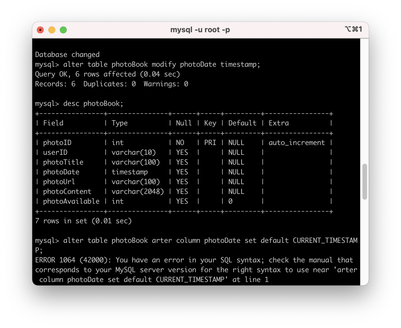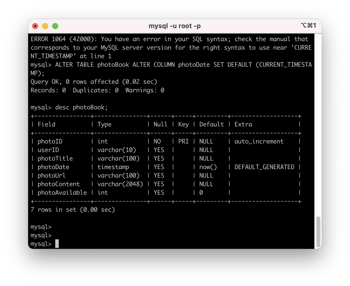 ERROR 1064 (42000): You have an error in your SQL syntax; check the manual that corresponds to your MySQL server version for the right syntax to use near 'CURRENT_TIMESTAMP' at line 1